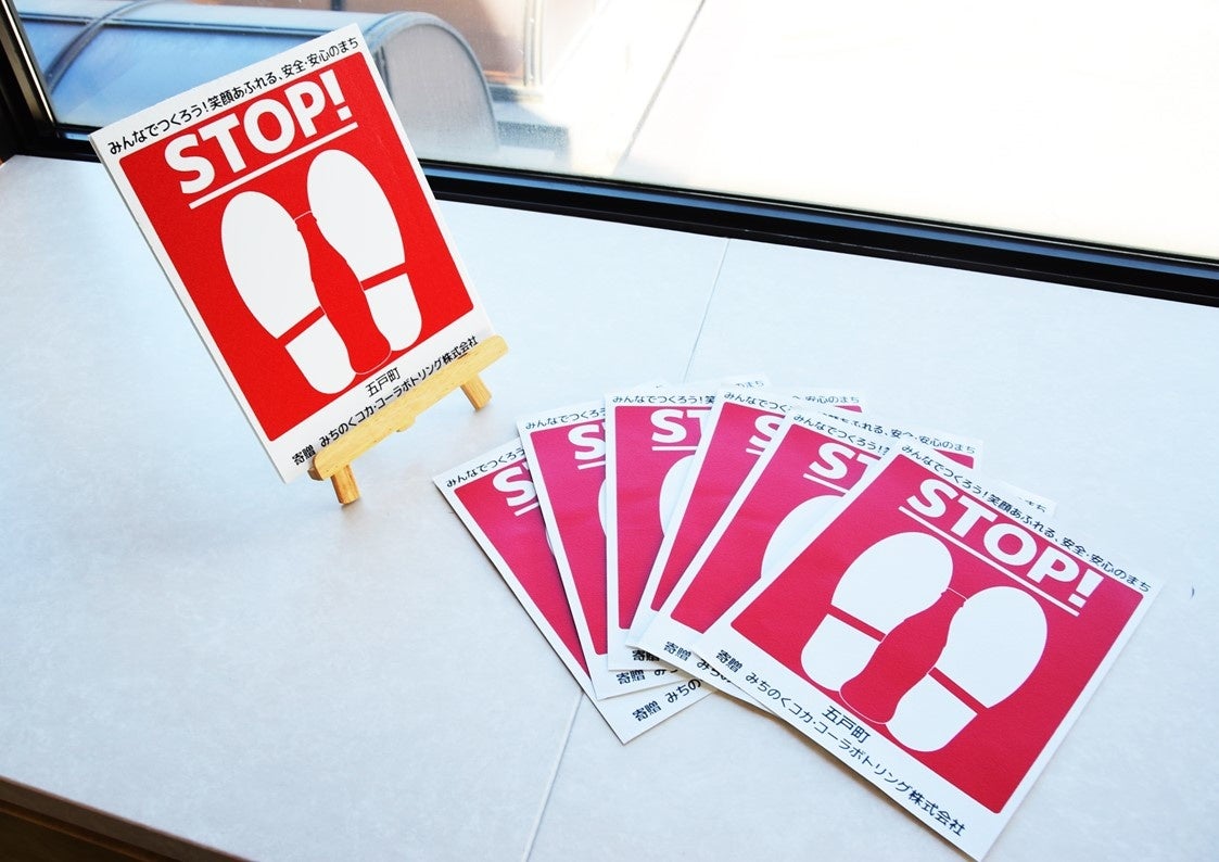 また、包括協定に基づく取り組みとして、「災害時における飲料の供給に関する協定」(以下「災害協定」)の締結および「ストップマーク」の寄贈を行いました。災害協定は、五戸町における地震、風水害等の災害発生時又は発生のおそれがある場合における飲料供給に関して必要な事項を定めており、同様の協定締結は北東北では89件目、青森県では37件目となります。「ストップマーク」は、交差点等の歩道へ貼り付けることで歩行者に対し一時停止や注意喚起を促すもので、このたびは100枚を寄贈いたしました。