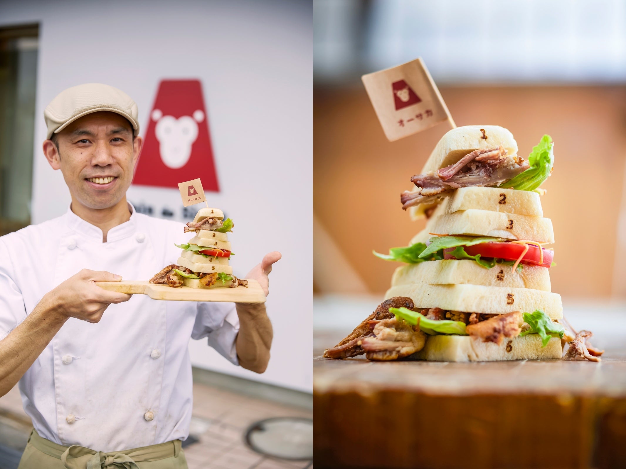 名物の“とびばこパン”をサンドイッチに。“なにわポーク”をスパイスやバーベキューソースで味付け、火を通した後に急速冷凍し、できたての味を閉じ込めました。