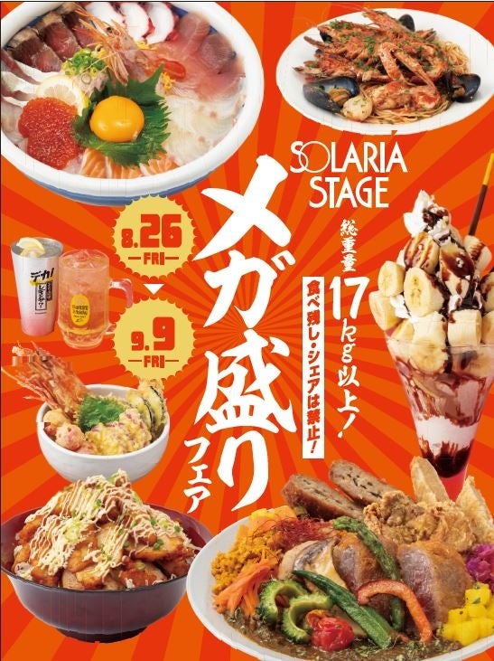 「メガ盛りフェア」とはソラリアステージの飲食・食物販計23店舗にてイベント期間限定の大盛メニューを提供する企画となっております。食べ残し厳禁!シェア禁止!自信のある方のみ挑戦可能の大盛り企画です!イベント期間は8月26日(金)~9月9日(金)となっており、期間中毎日実施いたします。皆様のお越しをお待ちしております。