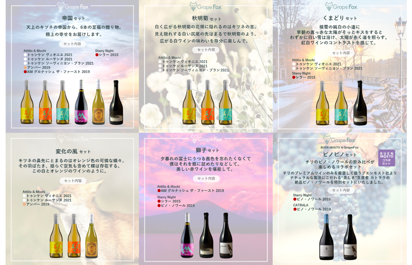 ただいまGrapeFox公式オンラインショップでは、初輸入とサイトオープンを記念して、お得な限定セットを先行予約受付中です。セット名ひとつひとつにも意味を込めました。GrapeFoxの世界を楽しんでいただけたらと思います。