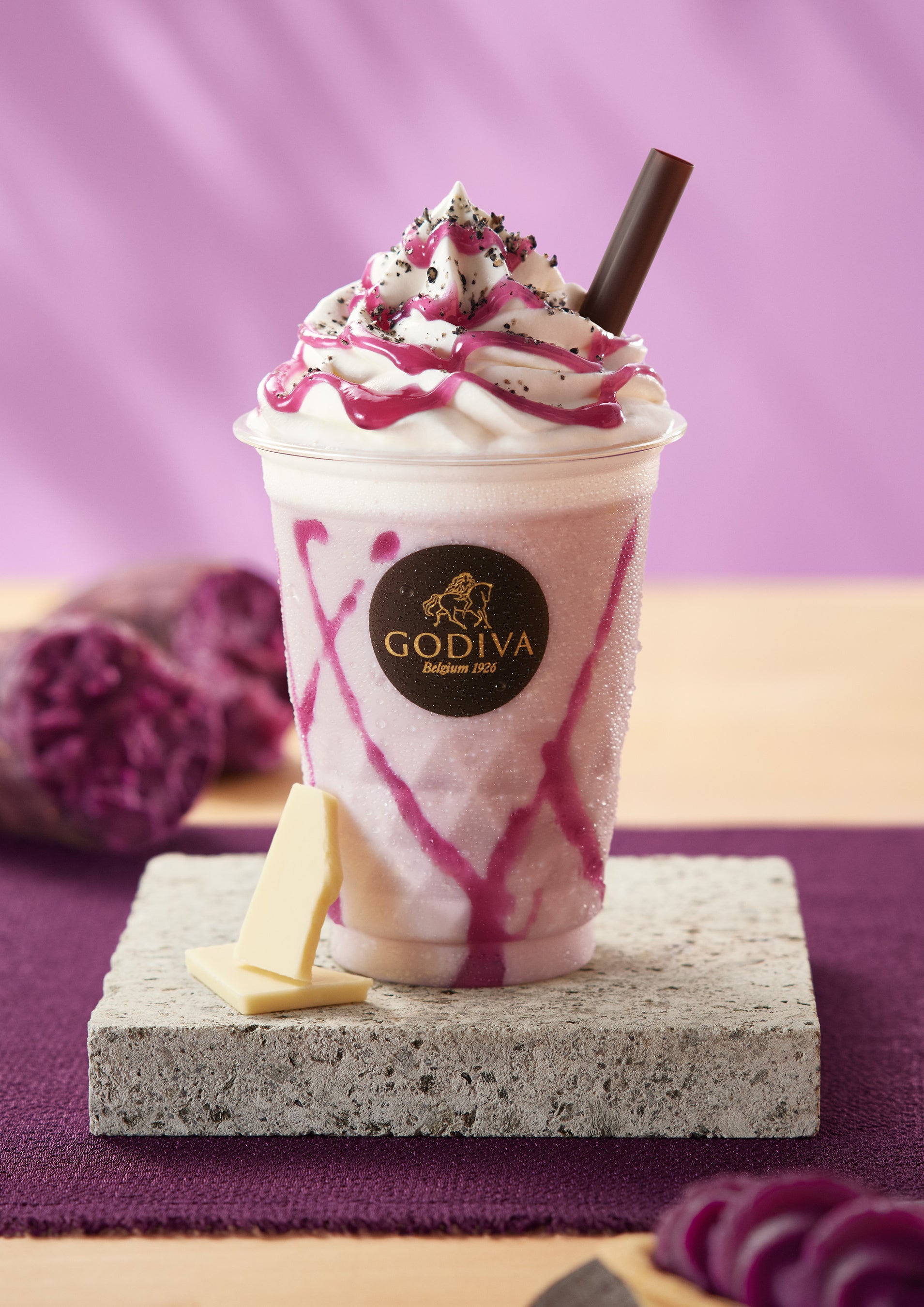 紅芋ソースの甘さとホワイトチョコレートの持つミルキーな甘さ、クリーミーなホイップクリームにほんのりと香る黒ゴマが和洋折衷のショコリキサーを演出します。