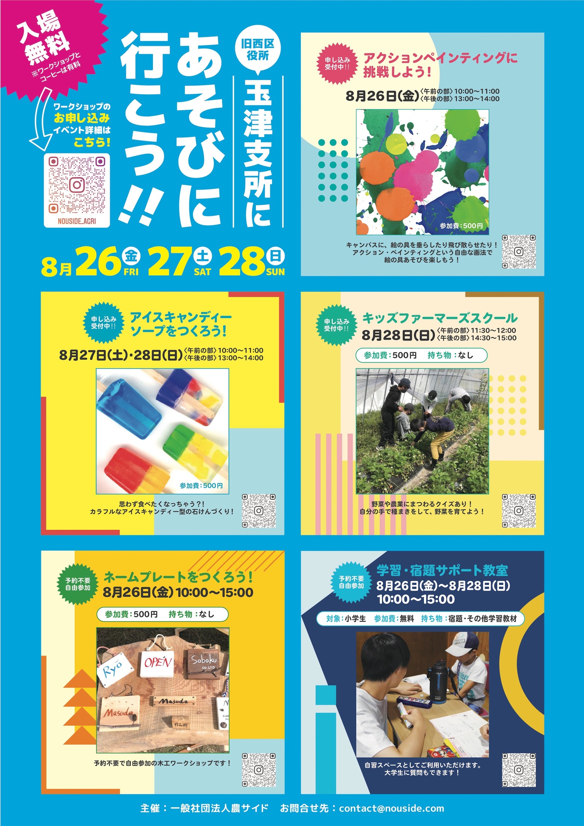 神戸市西区の玉津支所(旧西区役所)にて、「アクション・ペインティング」「アイスキャンディーソープづくり」「子ども向け農業教室」など、アート・農業・木工などを楽しめるイベントを開催します。夏休み最後の思い出づくりに、子どもたちはもちろん、大人のみなさんもお気軽にお越しください。