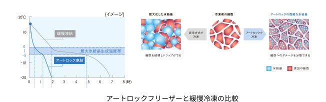 急速冷凍に凍結媒体ごとの特殊な技術を踏襲することで、さらに高品質な冷凍を実現する技術です。一般的な冷凍の場合、細胞内の水分が氷に変わる温度帯(氷結晶生成温度帯:-1℃~-5℃)の通過時に、氷結晶が大きく歪になることで細胞が損傷。一方急速冷凍は、急速かつ均一に冷却することで氷結晶が小さく生成され、細胞の損傷を極少化でき、うまみ成分の流出を防ぎます。さらに特殊冷凍では、冷風の湿度や冷風の当て方などの特殊技術が加わり、形状維持や調理済みのあたたかい食品の急速冷凍を実現。これまで困難とされていた食材の急速冷凍を可能にするとともに、従来を上回る高品質な冷凍食材を生み出します。