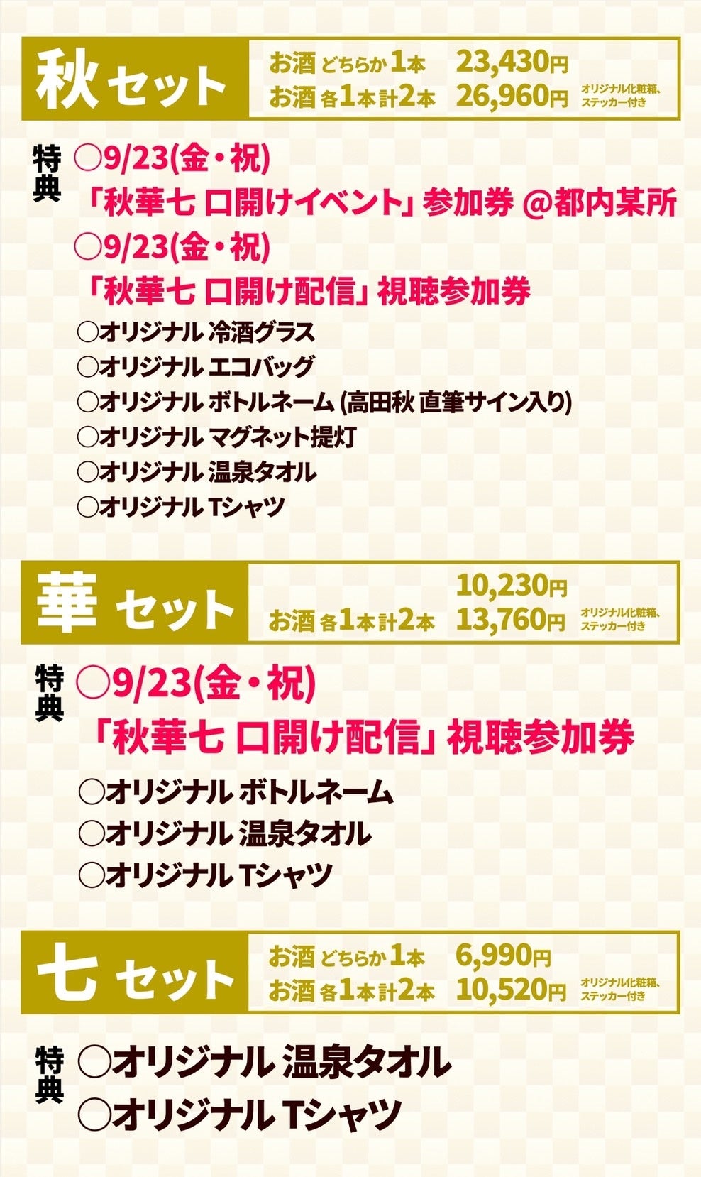 9月23日の発売に先駆け、イベント参加券やオリジナルグッズが付いた「秋・華・七」それぞれのセットの予約販売を開始。9月22日、23日にイベントを予定しています。