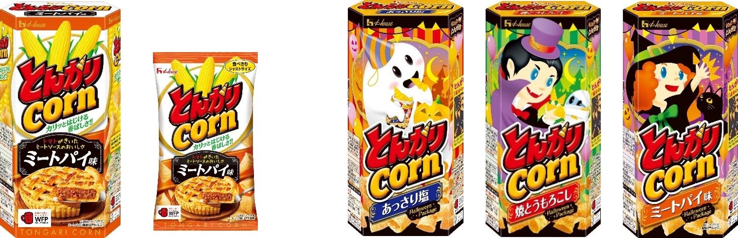 ハウス食品は、「とんがりコーン」シリーズの新アイテムとなる、「とんがりコーン」<ミートパイ味>を、8月22日から全国で発売します。またハロウィーンの季節を盛り上げる、「とんがりコーン」<あっさり塩><焼とうもろこし><ミートパイ味>の“ハロウィーンパッケージ”を、同日より数量・期間限定で発売します。