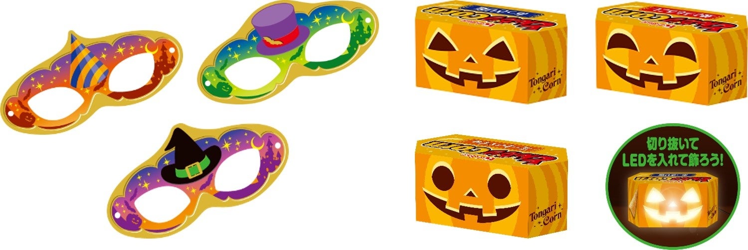 ハロウィーンを盛り上げる期間限定パッケージの裏面には、仮装を楽しめるお面やジャックオーランタンといった、パーティーにぴったりなハロウィーングッズを、切り抜いて作れるデザインを採用。今年もとんがりコーンを食べて、作って、飾って、“おうちの中での楽しいハロウィーンパーティー“を提案します。
