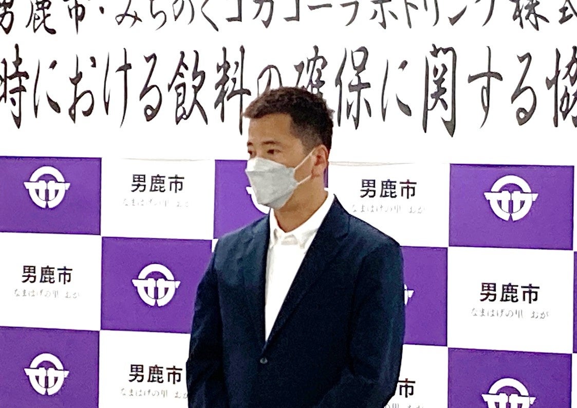 「ここ数日でも大雨による大規模な災害があり、県内では五城目町や三種町、由利本荘市において河川氾濫による被害が深い爪痕を残しました。最高警戒レベルの『緊急安全確保』が発令されるほどの災害に対し、まず確保しなければならないのが、食料や飲料などのライフラインとなります。北東北を拠点に事業を展開する当社は、こうした有事の際に、迅速に飲料を配送することを企業の社会的使命だと考えております。また、県内でも有数の観光地である男鹿市様は、当社が営業拠点を構えていた経緯や、2019年にもコカ・コーラ秋田限定ボトル缶のデザインにナマハゲを起用させていただくなど、何かとご縁がある自治体様です。今後も強力なパートナーシップを築くことで、有事の際には迅速な飲料の配送をお約束するとともに、双方の発展に向けて協力していければと思います。」