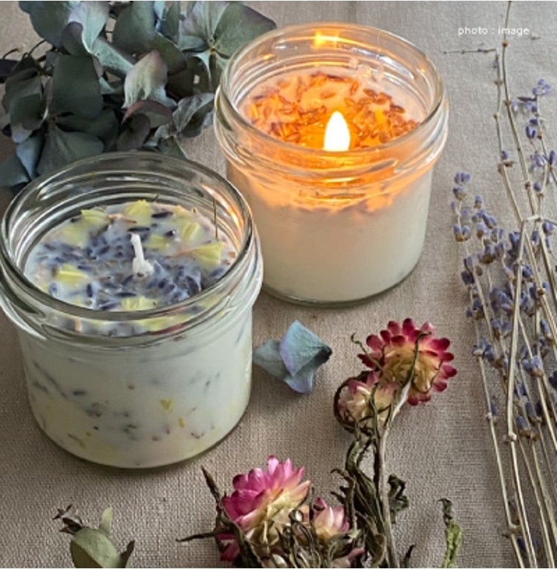 ホテルの装飾の過程で出る花の端材と、100%植物由来のソイワックスを混ぜて作る、環境負荷の少ないキャンドルです。ドライフラワーとオイルを自由に組み合わせ、オリジナルのキャンドルを手作りいただけます。