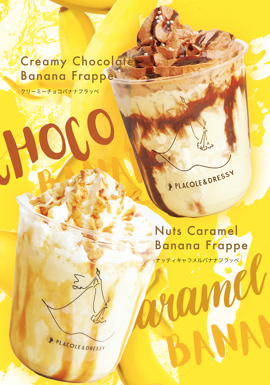 バナナを丸ごと1本つかったフラッペ。チョコレートとキャラメルの2種をご用意。クリームまでチョコレート、トッピングで食感も楽しめるチョコとバナナの王道の組み合わせと、たっぷりキャラメルソースで甘めのナッツがアクセントになりクリーミーでミルク感もある2種のフラッペとなっております。