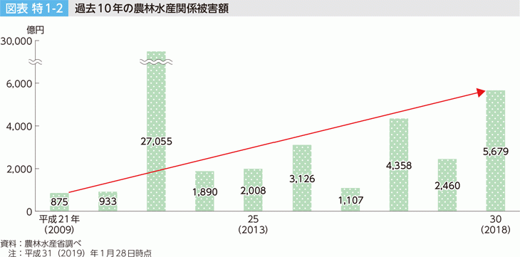 日本は四季のある豊かな国土ではありますが、近年は気候変動の影響をはじめとする、さまざまな要因の自然災害リスクが高まっており、常に農産物にも大きな被害が生じる可能性があります。実際に、農林水産省が出している「過去10年の農林水産関係被害額」のグラフからも、被害額が増加傾向にあることがわかります。