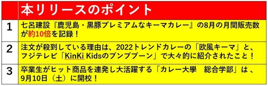 日本で唯一のカレー専門のコンサルティング会社である株式会社カレー総合研究所(代表:井上岳久/東京都渋谷区)は、同社の運営する「カレー大學」の卒業生が開発し販売するレトルトカレー「鹿児島・黒豚プレミアムなキーマカレー」(株式会社七呂建設)が8月の販売数が約10倍を超えることが確実になったことを発表します。