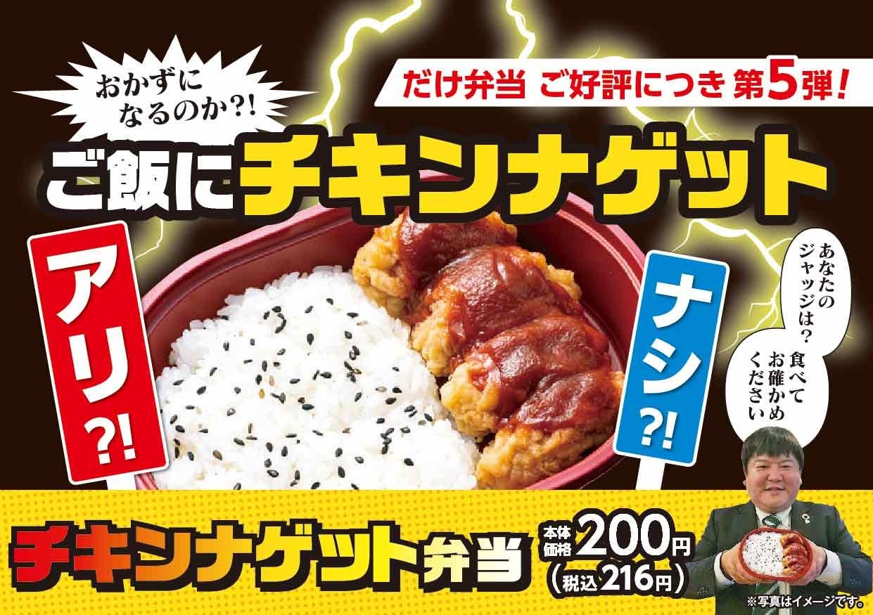 株式会社ローソンストア100(神奈川県川崎市)は、おかずが1つだけの「だけ弁当」シリーズ第5弾として、おかずはチキンナゲットだけの「チキンナゲット弁当(税込216円)」を2022年8月24日(水)より、全国の「ローソンストア100」(668店舗/2022年7月末現在)にて発売します。