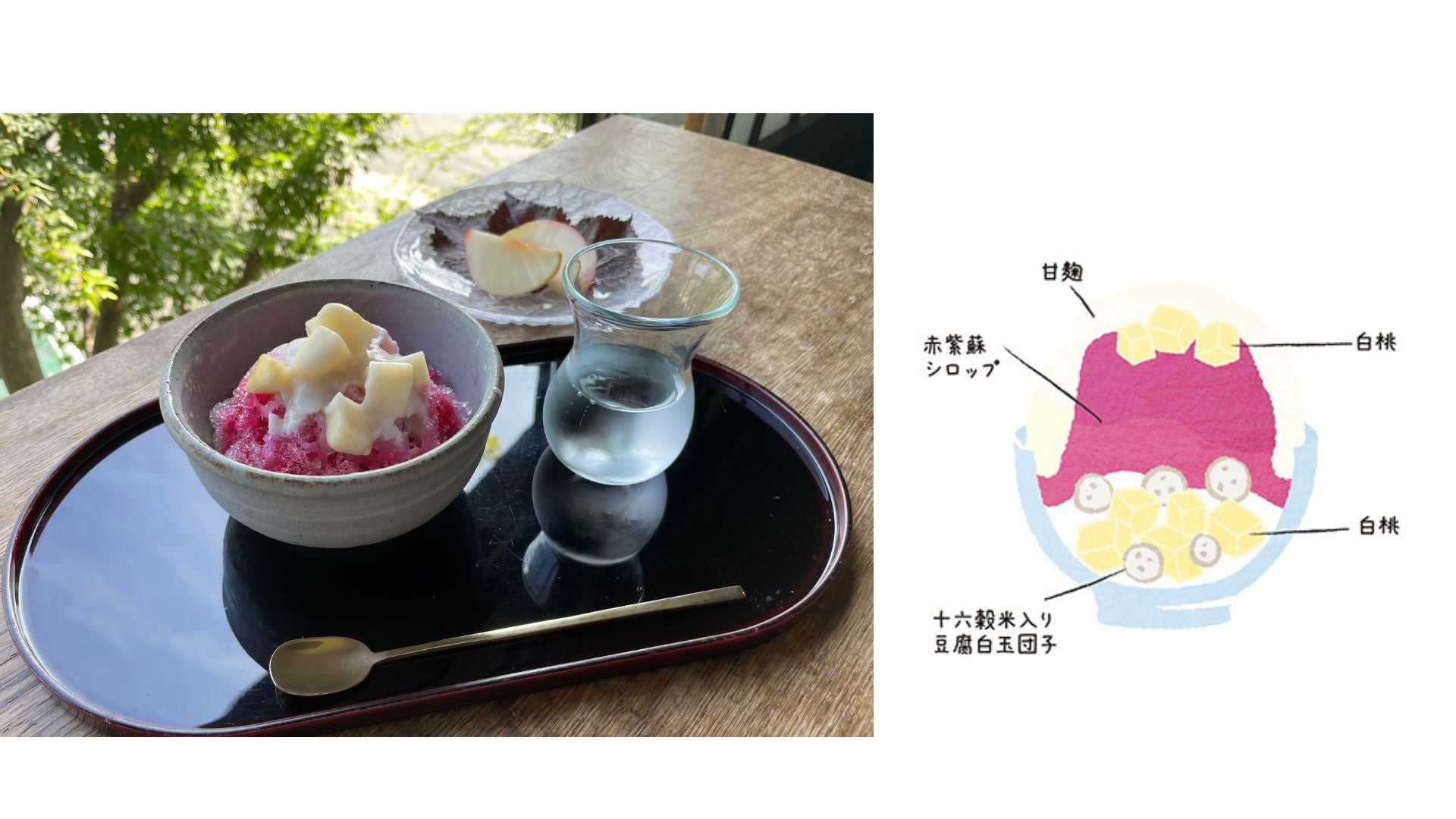 桃をたっぷり使用したかき氷に、赤紫蘇シロップを。自家製の甘麹シロップがアクセントに。