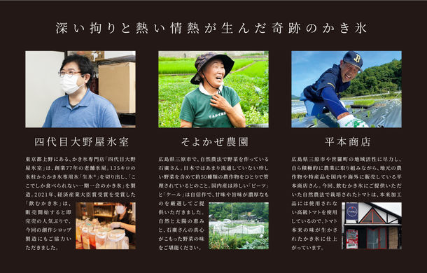 今年で創業65年となるフジスコでは氷みつは業務用をメインに販売しており、近年の消費動向に対応していきたいと思っていたところ、ある雑誌の記事で、氷屋である四代目大野屋氷室様が経済産業大臣賞を「飲むかき氷」という商品で受賞されており、アイデアと商品に感銘を受け「広島の地元のこだわりの野菜で作りたい」という片思いからこのコラボレーションは始まりました。