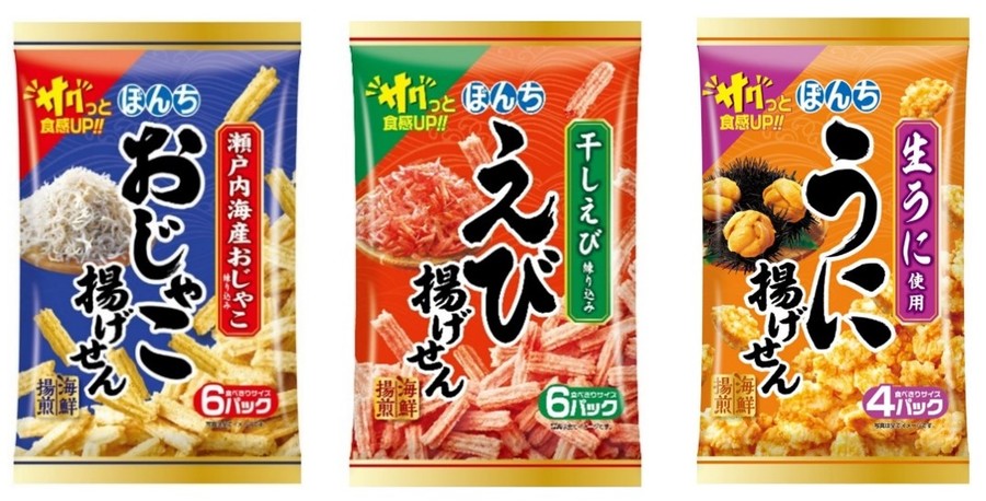ぼんち株式会社 (社長:遠藤 純民) は、「海鮮揚煎おじゃこ揚げせん」「海鮮揚煎えび揚げせん」「海鮮揚煎うに揚げせん」を9月5日(月)に全国でリニューアル発売します。