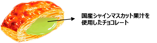 - サクサク食感のパイ生地に、国産シャインマスカット果汁を使用したチョコレートをとじ込めました。