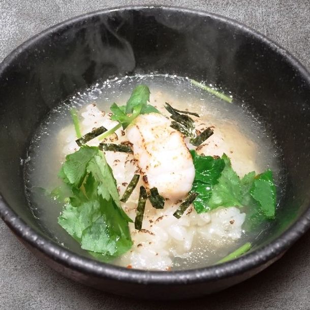 とらふぐの身と白飯を香ばしく炙り、「しおらぁ麺」の後に残ったらぁ麺スープをかけて完成する「てっ飯」。麺から溶け出した小麦の風味も感じる、らぁ麺の後でしか味わえない一品です。奈良漬けやワサビのアクセントがより一層美味しさを引き立てます。