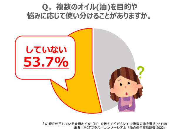 調査結果によると、「サラダ油・キャノーラ油・オリーブオイル・ごま油・こめ油・アマニ油・えごま油・MCTオイル・アボカドオイル」計9種のうち2種以上の食用油を使っているにもかかわらず、半数以上の53.7%の生活者が使い分けしていないという実態が明らかになりました。複数の油を持っているにもかかわらず、目的や悩みによって使い分けしていないというのは、実はもったいないこと。毎日何気なく使っているかもしれませんが、油にはそれぞれ特長があり、理解しておくことで料理を美味しくしてくれるだけでなく、自身や家族の健康を考える上でも非常に役立ちます。