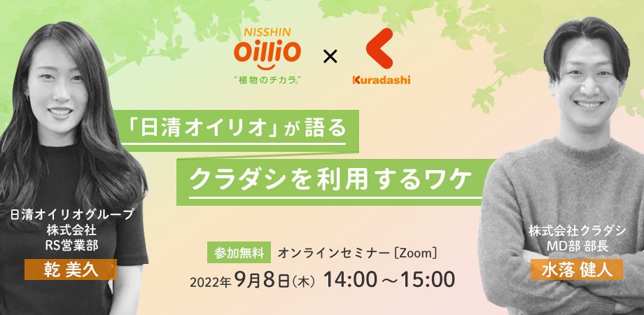 ソーシャルグッドマーケット「Kuradashi」を運営する株式会社クラダシ(本社:東京都品川区、代表取締役社長:関藤竜也、以下「クラダシ」)は、「Kuradashi」を活用した事業系フードロスの削減に向けた取り組みを知っていただくことを目的に、食品関連事業者を対象としたオンラインイベントを9月8日に開催いたします。本イベントでは、日清オイリオグループ株式会社の担当者をお招きし、「Kuradashi」の活用事例や、フードロス削減に向けた取り組みについてお話しいただきます。