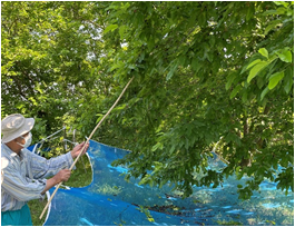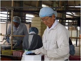 マルベリーは全て無農薬で育てており、収穫時期は5月中旬~6月中。木の下方に大きなネットを設置し、棒を枝にひっかけて揺らすことで熟した実を落とします。集まったマルベリーは一粒ずつ手作業で選別と洗浄、袋詰めまで行います。丁寧に心を込めて作業しています。