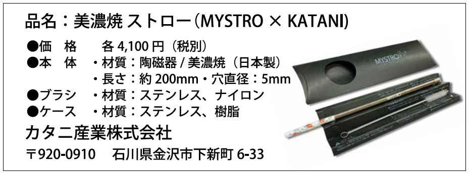創業120余年の老舗金箔メーカー・カタニ産業株式会社(本社:石川県金沢市、代表取締役:蚊谷要平)」は、繰り返し洗って使える「陶磁器のストロー」を9月8日(木)より販売します。プラスチックゴミが海を汚し、生き物の命を脅かしている、いわゆる ″プラゴミ″問題。この解決策として考えられたエコなSDGs製品です。工芸品とはその時代ごとの生活の中で息づくもの。今の時代なら、やはリ環境問題に対応した商品づくリが必要。そんな考えの中から生まれました。