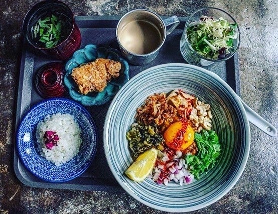 ・ひつじのまぜそば ・ダイブ飯 ・淡路鶏のフライドチキン ・サラダ ・スープ ・締めのチャイ