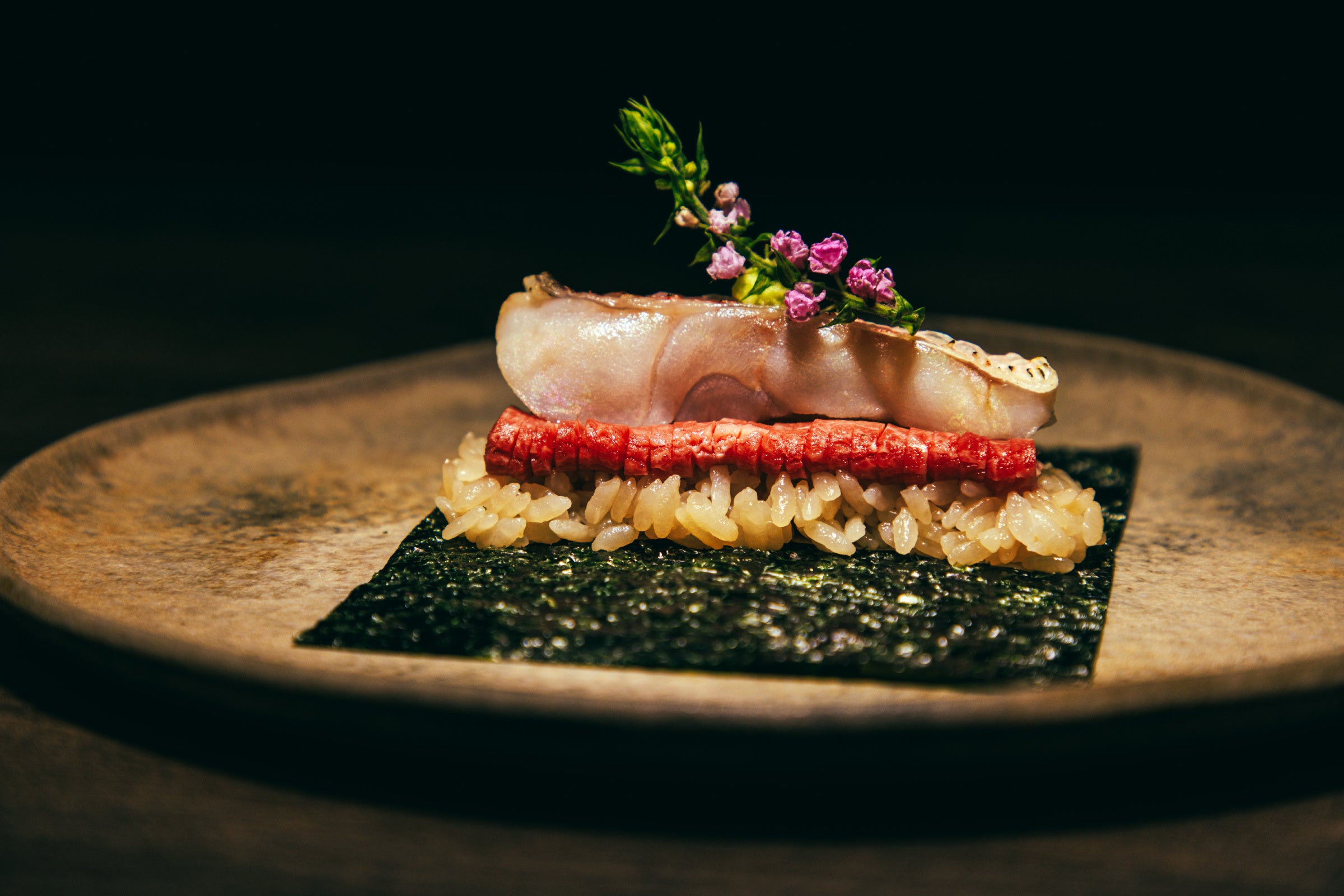 香ばしく塩焼きした“甘鯛”を主役に、厳選した和牛の赤身とキリッとした赤酢のシャリを、磯の香り豊かな極上海苔“こんとび”で包んでお召し上がりください。