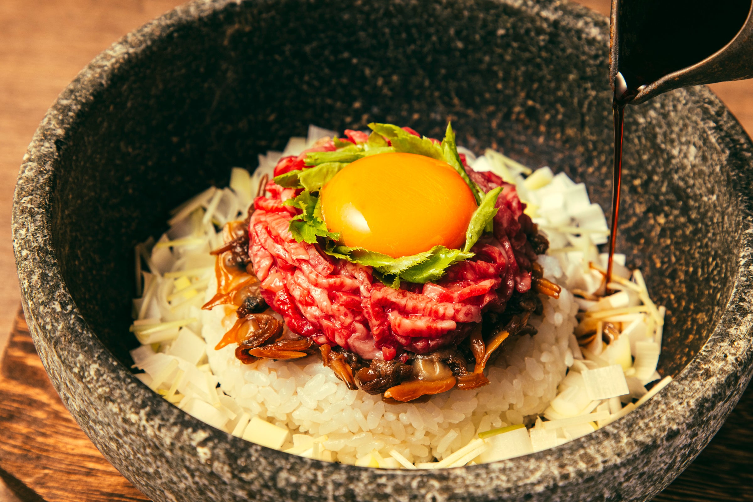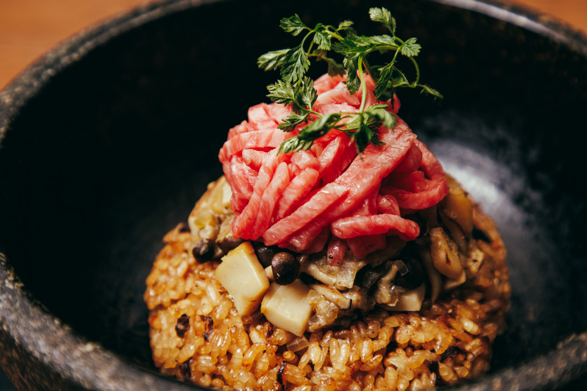 - 石焼ポルチーニリゾット 和牛ユッケ添え 1,650円 【うしごろバンビーナ】