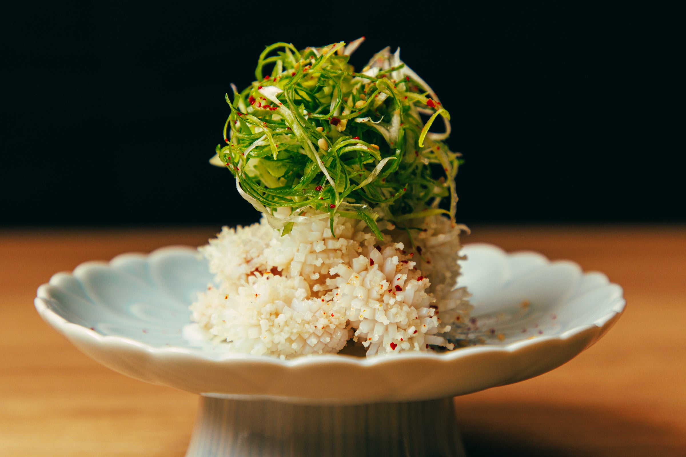 鮮度にこだわった“ウルテ”を昆布出汁と日本酒で丁寧に湯引きしました。2種の香味油をまとわせた風味豊かな京都産の九条ねぎと一緒にお召し上がりください。小気味よい食感が癖になる酒肴をお楽しみください。