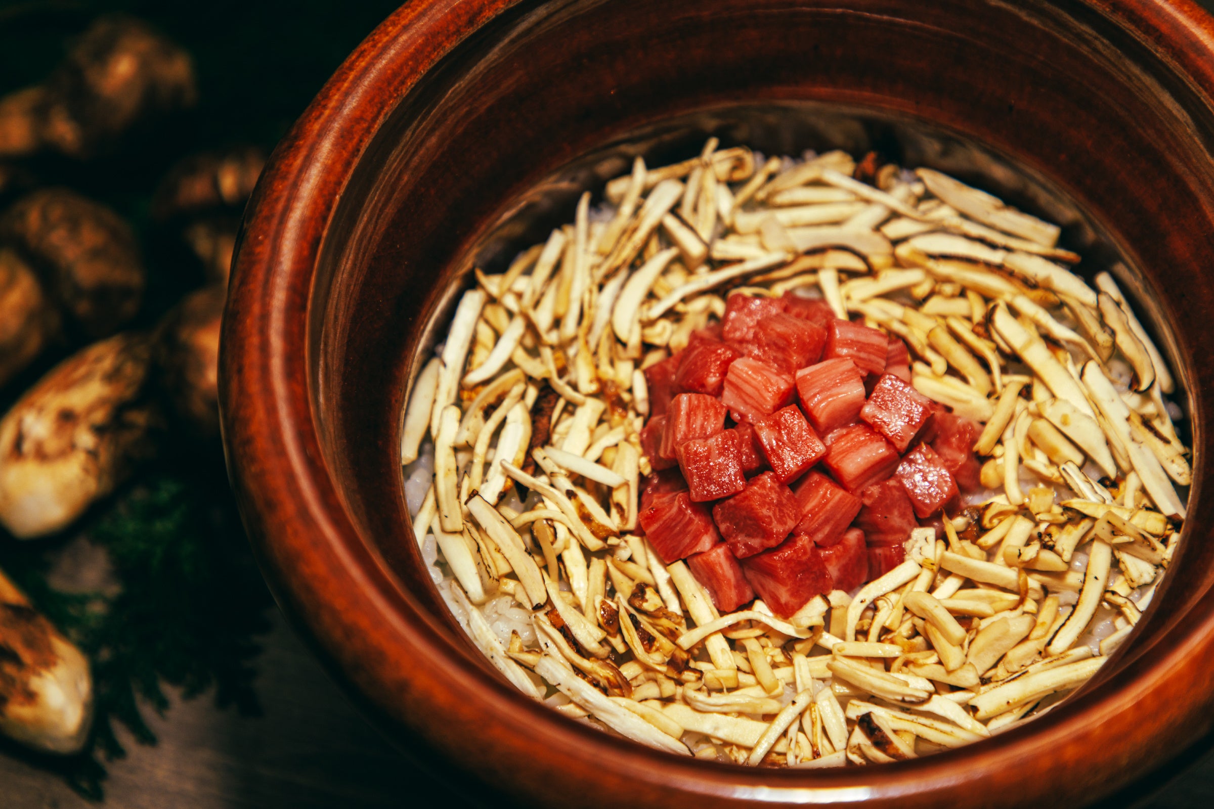 今が旬の松茸と旨みの凝縮した牛ヒレを炊き立ての土鍋ご飯にたっぷりと敷詰めた華やかで贅沢な〆です。余熱だけでレアに仕上げた、とろける食感の和牛と松茸の香気をお楽しみください。