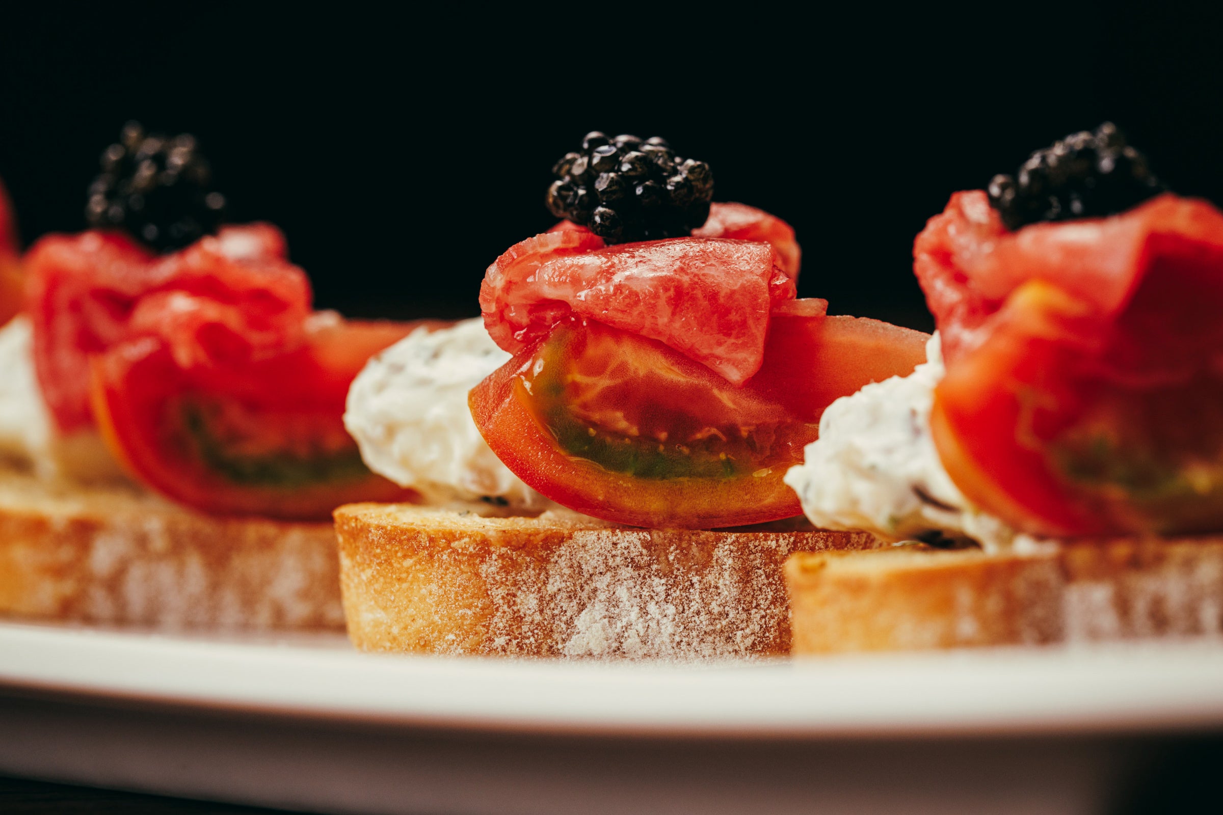 旨みを凝縮させた和牛ブレザオラと濃厚なクリームチーズ、黒い宝石「キャビア」をサクッと香ばしいバゲットにのせました。クリームチーズのコクとキャビアの塩みが和牛の旨みを引き立てる華やかな前菜です。