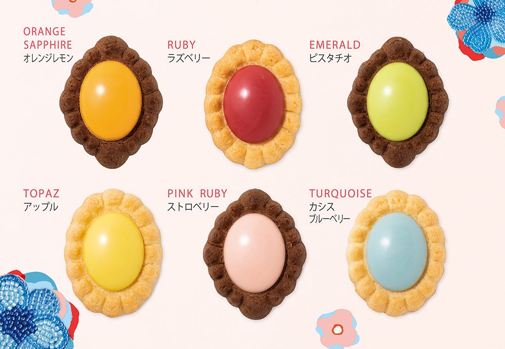 お味は全部で6種類。どれも宝石をイメージした美味しさとカラーでお作りしています。華やかなレッドルビー『ラズベリー』を筆頭に、可憐なピンクルビー『ストロベリー』、高貴なグリーンエメラルド『ピスタチオ』、爽やかなイエロートパーズ『アップル』、神秘的なブルーターコイズ『カシスブルーベリー』、元気をくれるオレンジサファイヤ『オレンジレモン』。ひと目でひと口で心がとろけてしまう、“クッキーに縁どられた宝石ボンボンショコラ達”をどうぞ召しあがれ!