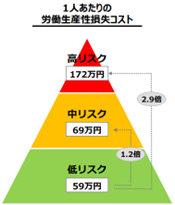 健康経営については、社会的関心が高まる一方、施策の効果検証やPDCAサイクル実行の難しさが課題となっています。また経済産業省*1の資料によると、従業員の健康リスクと労働生産性損失には関連があり、低リスク層と比較して高リスク層では2.9倍の労働生産性損失があると推定されています。
