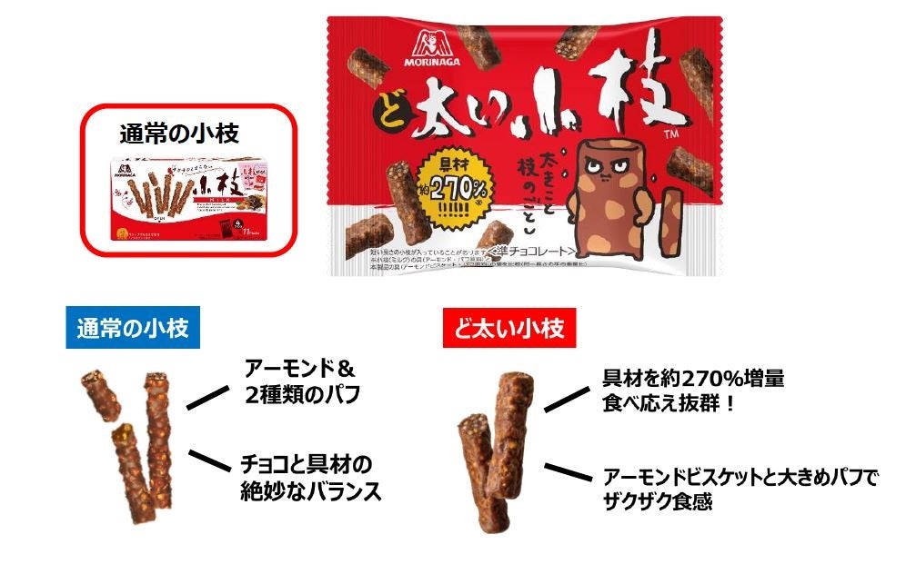 「ど太い小枝<ミルク>」は、通常の「小枝<ミルク>」より具材を約270%※も増量した、アーモンドビスケットとパフ入りでザクザクした食感と食べ応えが感じられる「小枝」です。また手につきにくい品質で、休憩や息抜きにちょっとつまんで、手軽に気分転換をしていただける商品です。パッケージに描かれている愛らしいキャラクターの商品や特長に関するユニークなセリフもお楽しみいただくことができます。食べ応え抜群の特別な「小枝」の発売で、チョコレート市場を楽しく盛り上げてまいります。