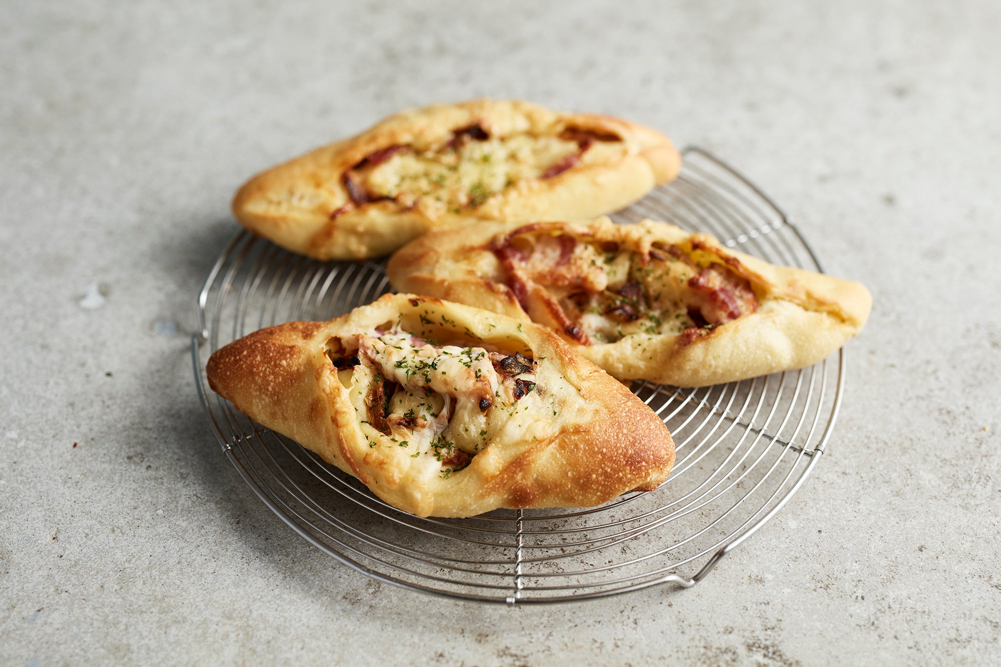 今回は、甘みと旨みが凝縮した「乾燥札幌黄」とベーコンを、「デュラム小麦」を使用した生地で包み焼き上げました。しっとりもちもちとした食感や甘みとコクが感じられる生地とベーコンの塩気が「札幌黄」を引き立てます。