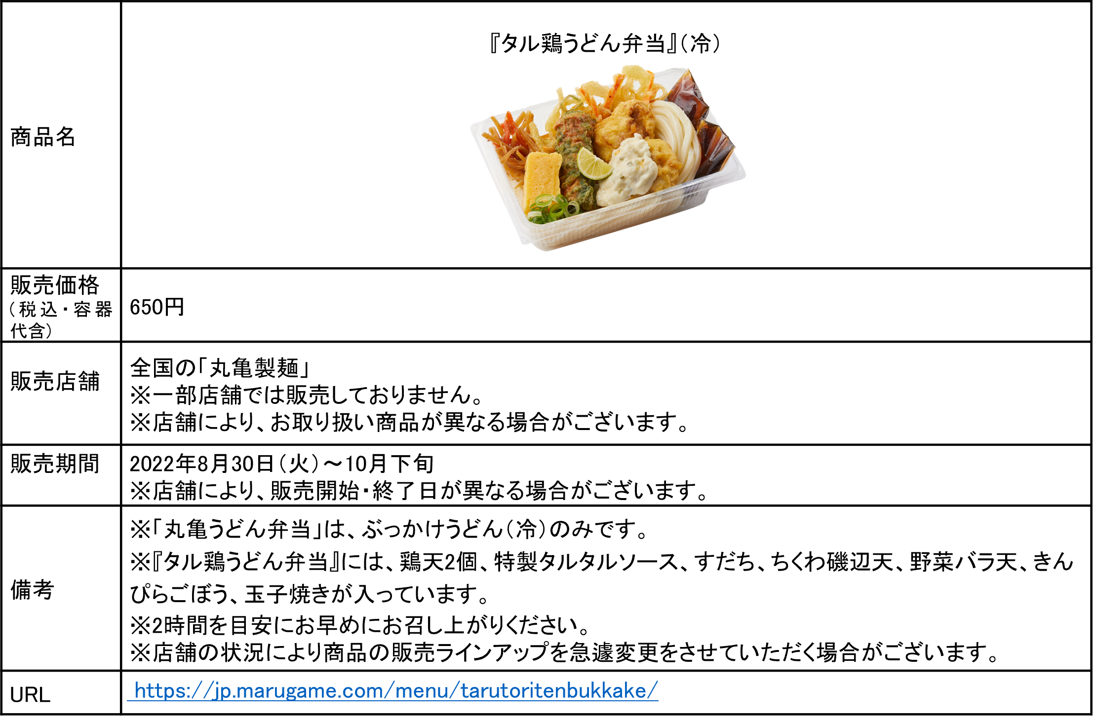 株式会社丸亀製麺(本社:東京都渋谷区、代表取締役社長:山口 寛)が展開する讃岐うどん専門店「丸亀製麺」は、『タル鶏天ぶっかけうどん』『辛(から)タル鶏天ぶっかけうどん』、『タル鶏うどん弁当』を2022年8月30日(火)から全国の丸亀製麺にて期間限定で販売いたします。