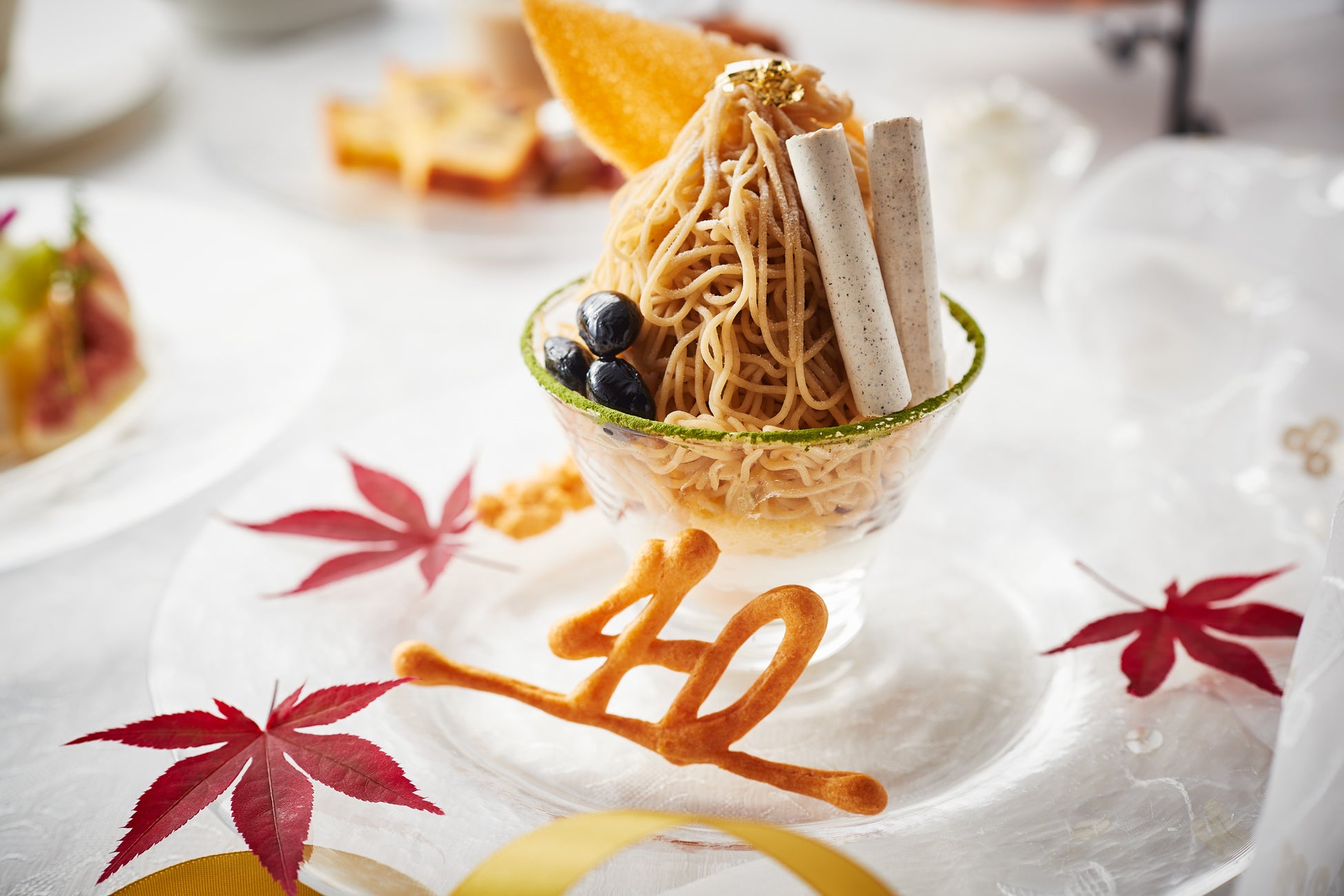 メレンゲ、ホイップクリーム、スポンジ、栗の甘露煮の上にたっぷり絞った丹波栗のクリームが贅沢。トッピングの丹波の黒豆やほうじ茶のメレンゲ、添えられたクッキークランブルが食感にアクセントを添えます。