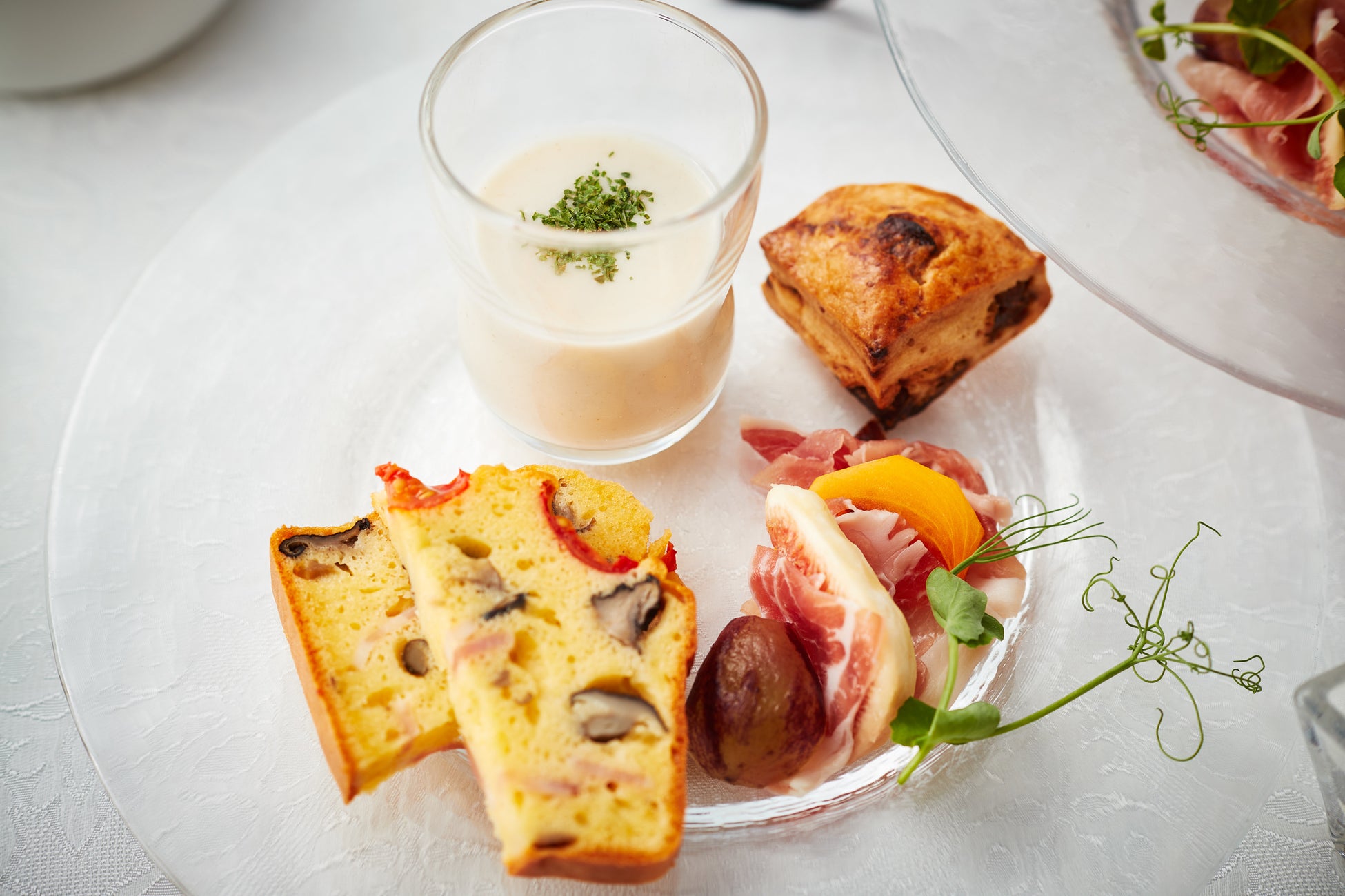 中段、下段にも、シャインマスカットショートケーキや、ティラミス風タルト、味変にもぴったりな秋のフルーツと生ハムのロール、ごぼうポタージュなど、美しく秋らしいスイーツとセイヴォリーが並びます。