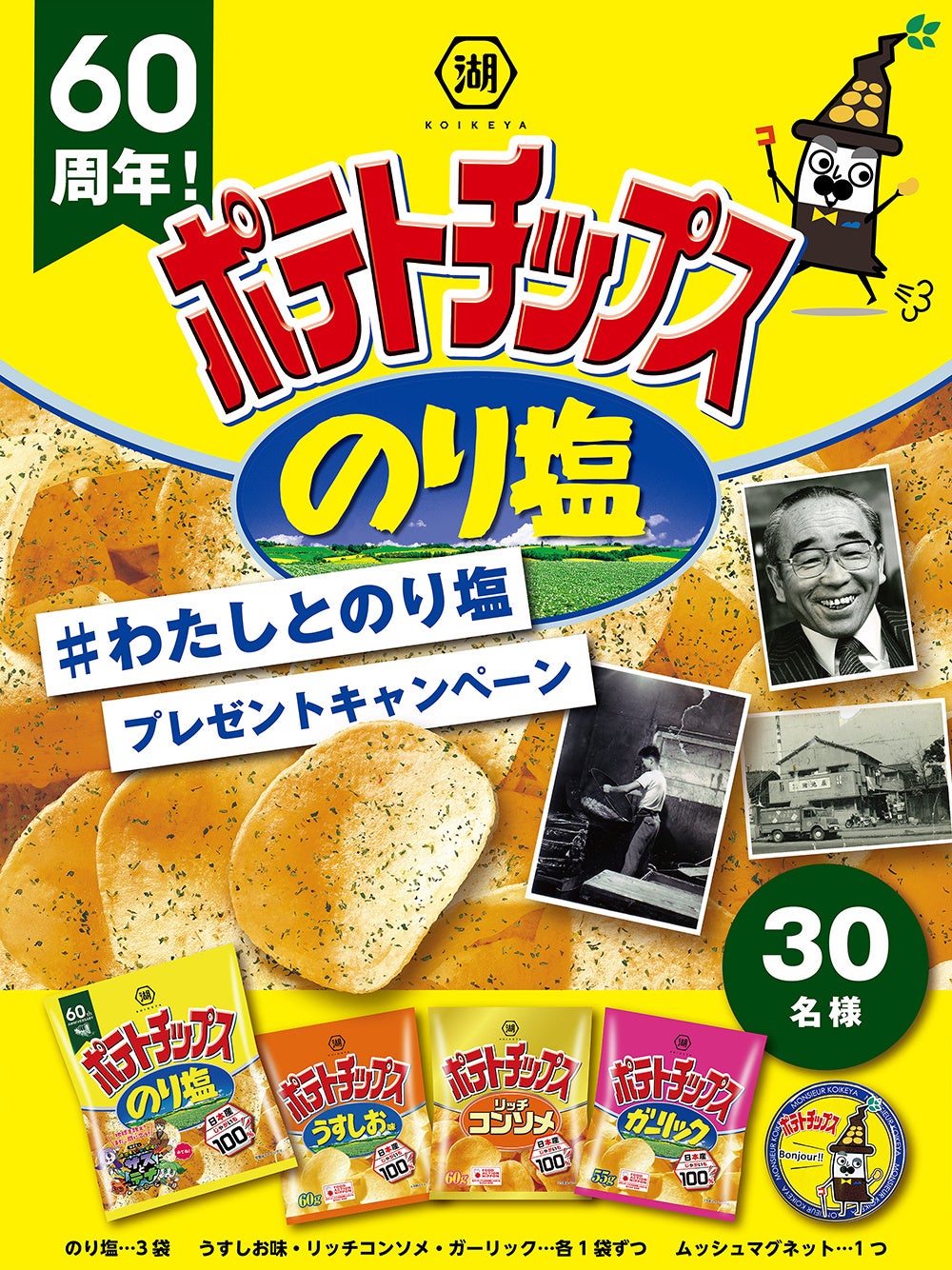 湖池屋は、「食でくらしをゆたかに。」をテーマに、みなさまに喜んでいただけるような様々な商品開発や取り組みに今後も努めてまいります。発売60周年を迎えた「湖池屋ポテトチップス のり塩」をはじめ、今後ともご愛顧の程、どうぞよろしくお願いいたします。