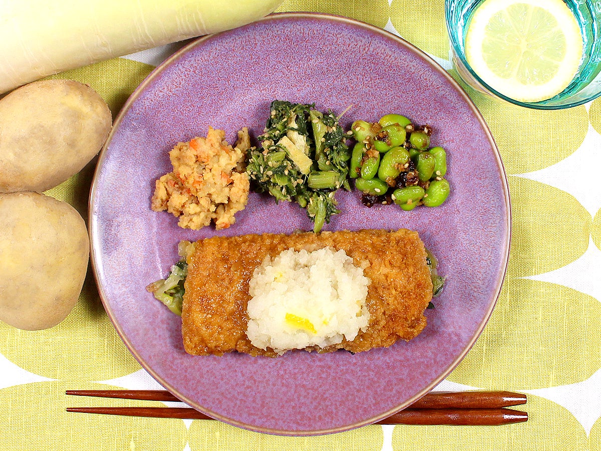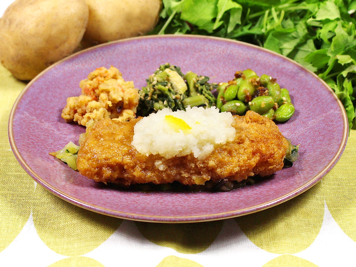 ジューシーさと肉の甘みが特徴のロースカツに、大根おろしをのせたおろしぽん酢カツです。大根おろしには香りのよい柚子を混ぜております。和風だしとマイルドな酸味が特徴のぽん酢を合わせ、暑い夏でもさっぱりとお召し上がりいただけます。