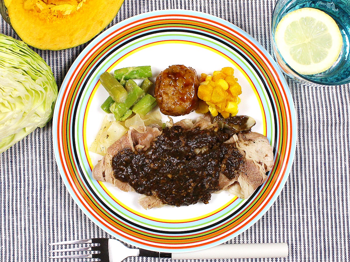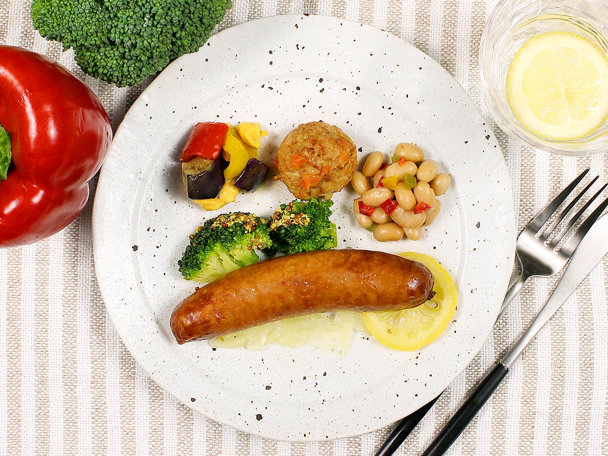 副菜は、ミックス野菜のグリル、野菜ソースを絡めたベジボール、たまねぎドレッシングで和えた白インゲン豆とパプリカのサラダです。