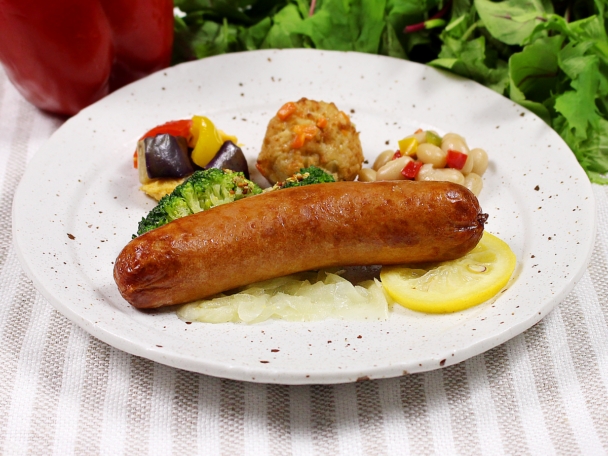 スパイシーで肉感たっぷりのソーセージとブロッコリーをシンプルに合わせました。ブロッコリーは粒マスタードで和えており、程よい酸味が特徴です。食べ応えのあるソーセージのプレートになっております。