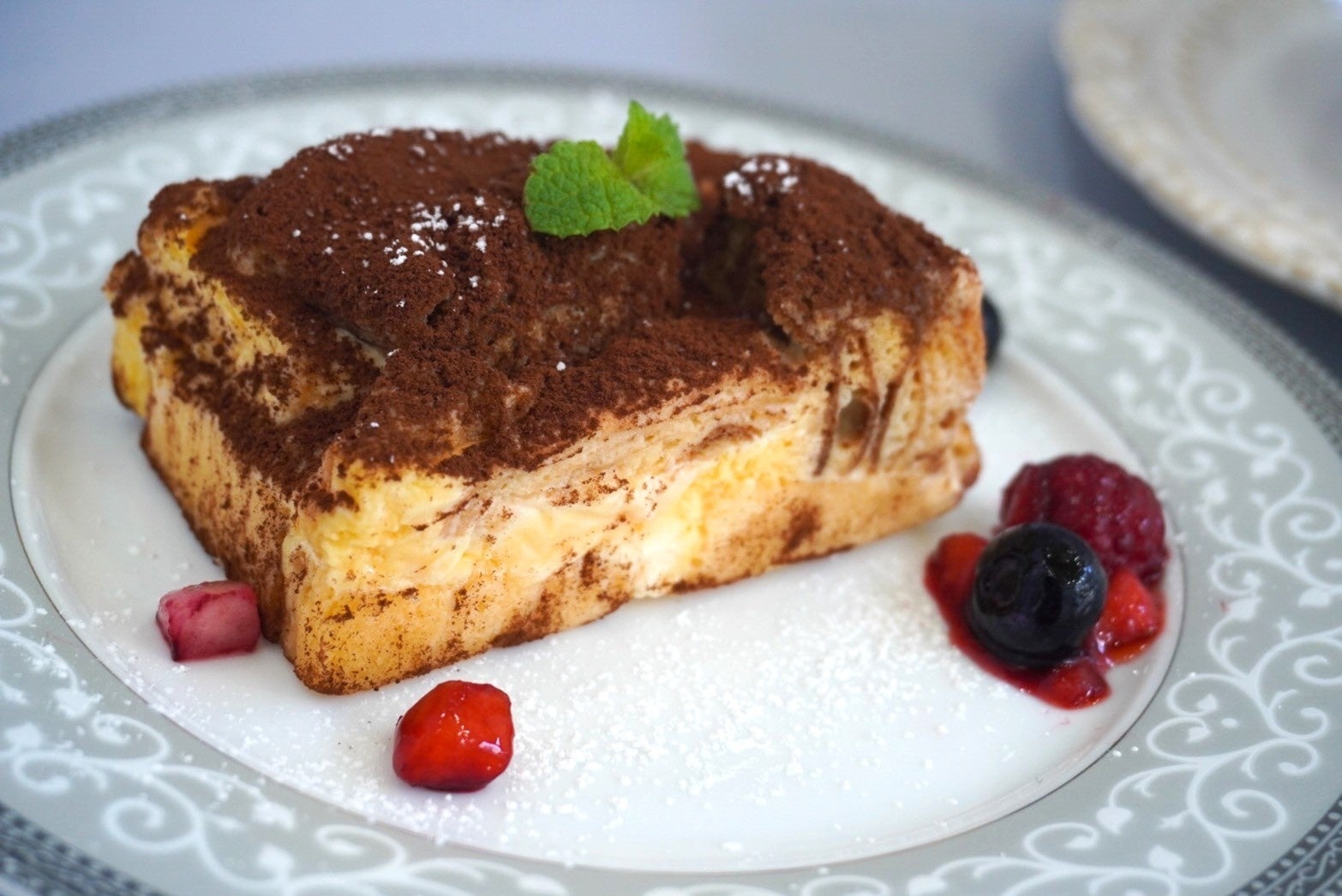 なめらかクリームチーズと、ほろ苦コーヒーのハーモニー。ティラミスは、北イタリア生まれのスイーツです。名前の由来は「Tirami su!(私を元気づけて)」。コーヒーソースをたっぷり吸った陽乃樹とミルクの風味が豊かなクリームチーズの組み合わせは、あなたの口角をキュッと上げてくれるでしょう。さあ、仕上げにココアパウダーを上から散らせば、本格ティラミスの完成です!(使用バウムクーヘン:陽乃樹)
