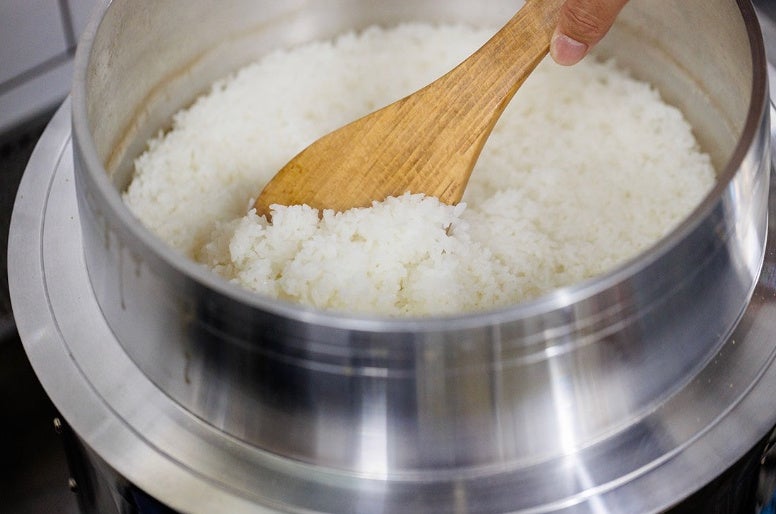 水分を閉じ込めたもっちりと冷めても美味しいごはんは、熱伝導の良いアルミ製の羽釜とかまどを使用することで対流が生まれ、お米の一粒ひと粒にム ラなく熱が伝わる直火炊き。ポークランチョンミートやたまごなどをサンドして食べるポーたまでは、具材の味が引き立つよう、お米の甘みが際立ちすぎないあっさりとした味わいのごはんに炊き上げます。