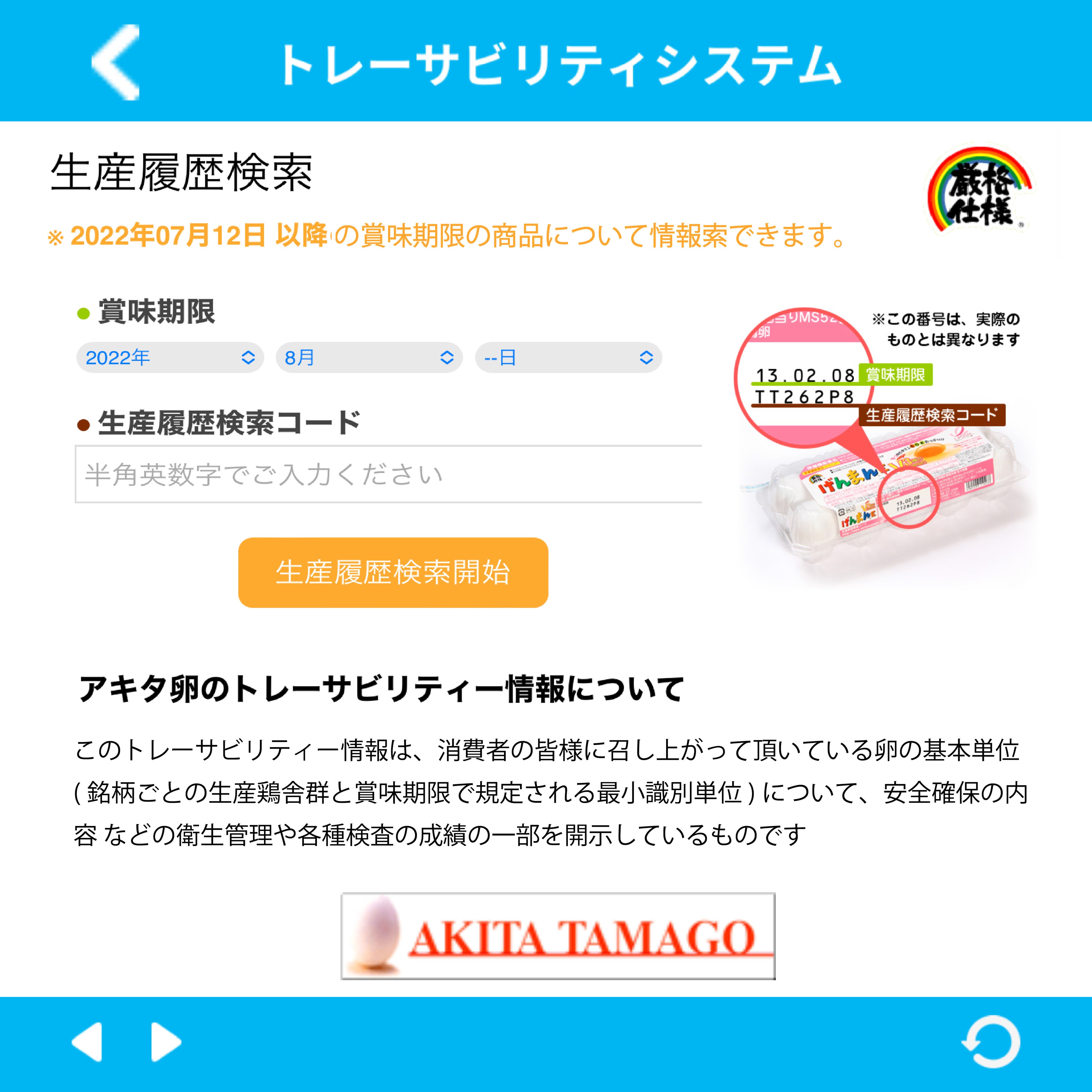 本アプリでは、アプリ内の生産履歴検索画面で、商品パッケージに記載されている賞味期限と、7桁の生産履歴検索コードを入力いただくことで、生産農場と生産者、商品特徴など生産履歴の基本情報をはじめ、サルモネラ(SE)対策の情報や鳥インフルエンザ(AI)検査結果を確認いただくことができるほか、飼料原料のトレースバックなども可能にしています。