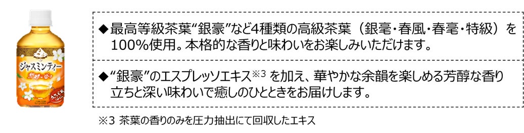 そこでこの度、4種の高級茶葉(銀毫・春風・春毫・特級)を100%使用した、本格的な香りと味わいの「贅沢香茶 ジャスミンティー」を新発売。
