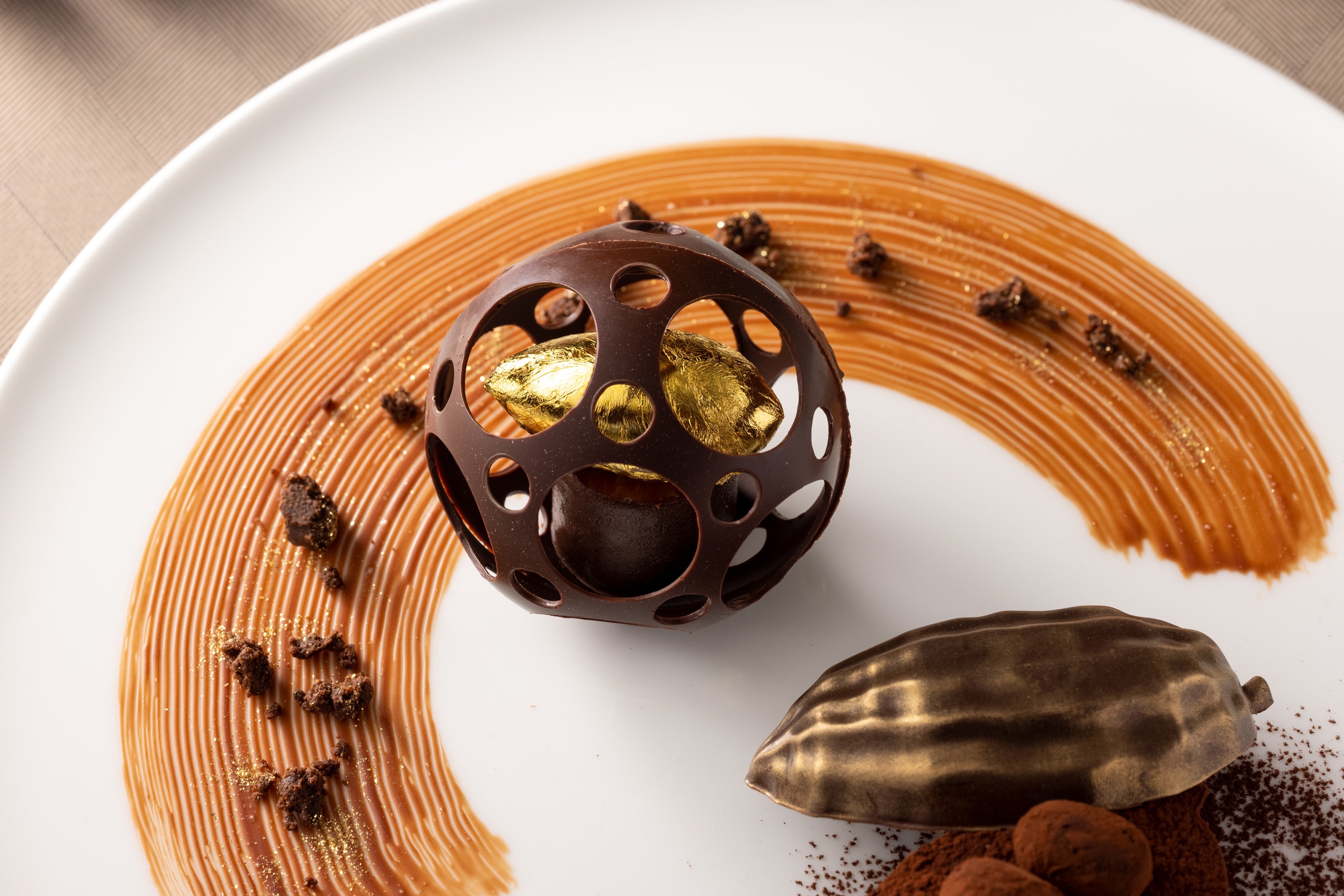「カボス」(写真手前)は、「カカオの実」からできたチョコレートをそのまま再現したユニークなデザートです。蓋を開けると、中にはヴァローナの『マンジャリ』を使用したガナッシュが詰まっており、潜ませているフレッシュラズベリーの爽やかな酸味、種を模したトリュフのコクと甘味とのマリアージュをお楽しみいただけます。「洗練された<ニャンボー>チョコレート」(写真奥)にはヴァローナの『ニアンボ』を使用。ガナッシュ・モンテを詰めたフィアンティーヌの上には、金箔に包まれたニアンボのプラリネアーモンドのムースをあしらいました。神秘的ともいえる球体状のフォルムは、パティシエの技術の粋を集めた逸品です。