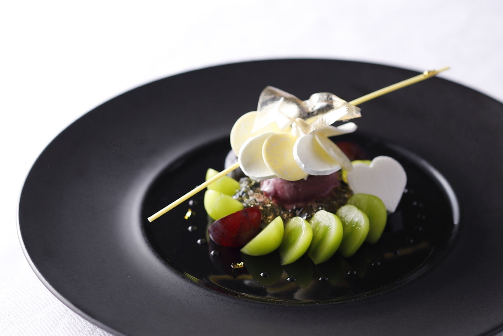お皿の中央にシャンパンジュレとマスカットジュレを敷き、その上に葡萄のシャーベットをのせて、まわりにはシャインマスカットを添えました。マスカットのパピエやホワイトチョコレートなどを飾りつけ、ハート型のシャインマスカットギモーブがアクセントでかわいらしさも演出。