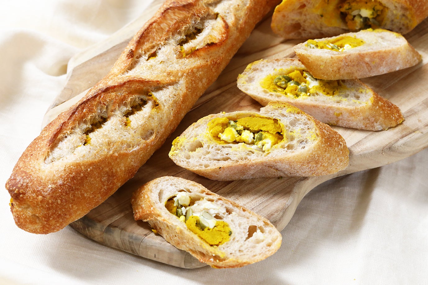 かぼちゃを裏ごしして作ったペースト、クリームチーズ、かぼちゃの種を織り込んで仕上げた季節のバゲットです。旬を迎えるかぼちゃの程よい甘みに加え、クリームチーズの口当たりなめらかな味わいをお楽しみいただけます。かぼちゃを使用した秋の訪れを感じる味わいに、かぼちゃの種の食感がアクセント。具沢山なバゲットはおかずの代わりとして朝食や夕食にもおすすめです。