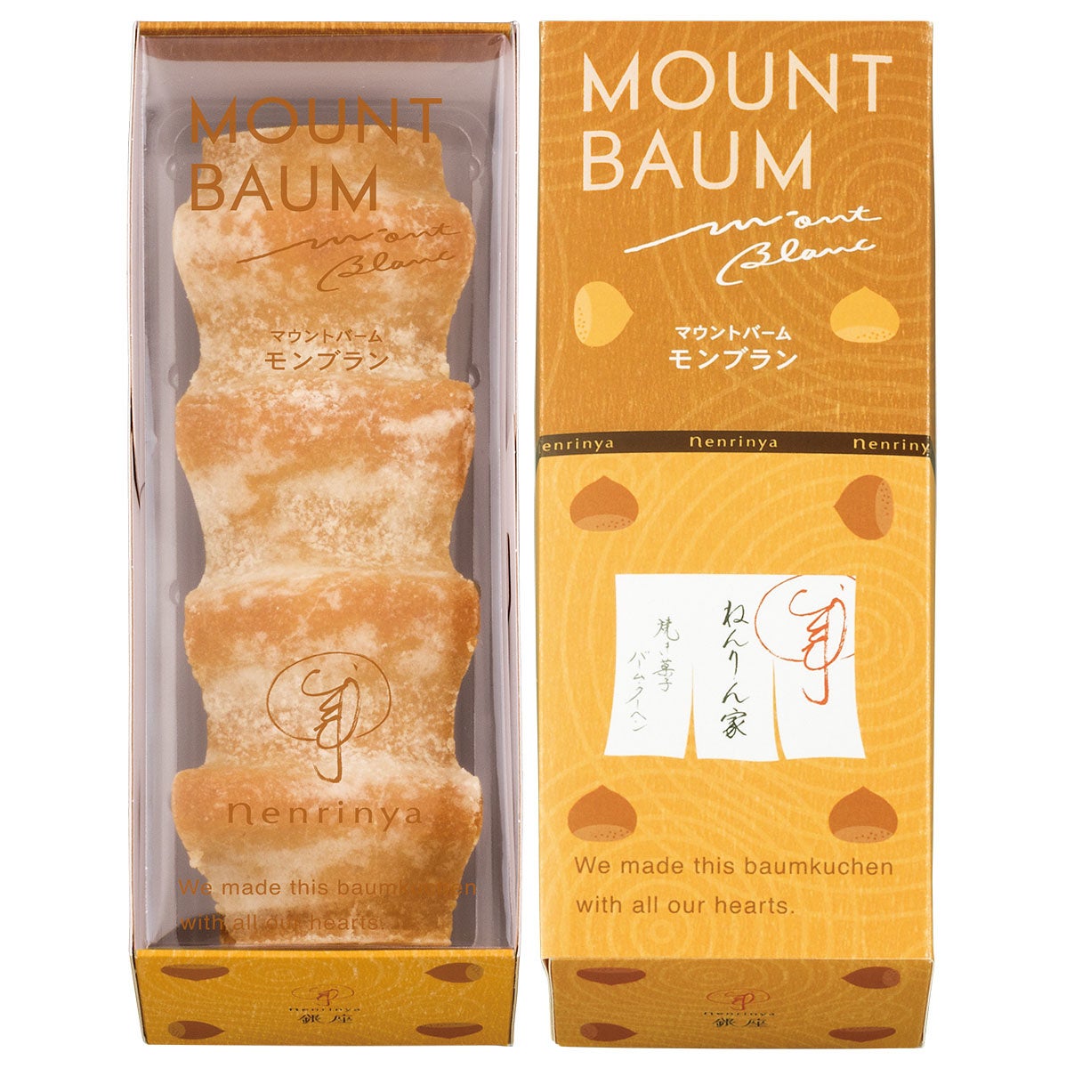 ねんりん家の代表作”マウントバーム しっかり芽”から、秋限定「マウントバーム モンブラン」が登場。秋に色づく山並みのように美しく焼き上げた生地に、栗のうまみと香りを贅沢に閉じ込めました。一層、一層、突き詰めた栗の味わいをご堪能いただける、この季節だけの特製バームクーヘンです。